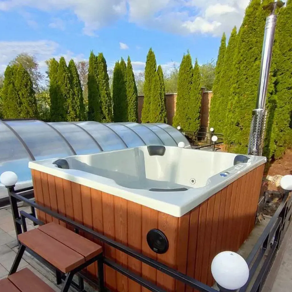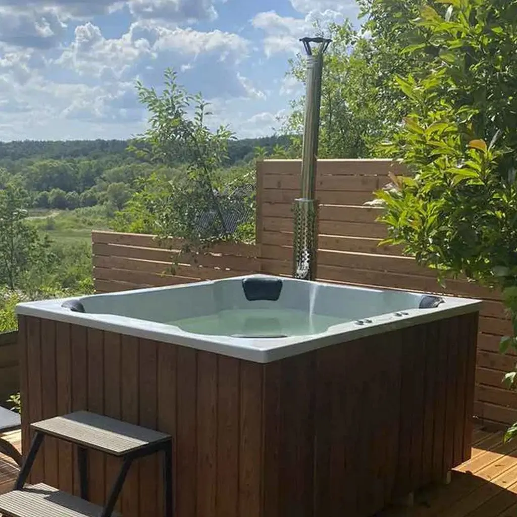 SPA купіль на дровах “Етна” із зовнішнім котлом – це чан прямокутної форми, розмірами 2,0 м * 1,7 м * 1,1 м, обшитий натуральним деревом та створений для водних термопроцедур в зимову пору. Завдяки фінській технології дерево знаходиться ззовні чаші, зберігає свої первинні властивості, а чаша виготовлена з високоякісного композиту, що не гниє, не деформується, не вступає в реакцію з водою. Шукаєте чан з аеро- та гідромасажем для ековідпочинку і відновлення сил? Перед вами відмінний вибір для компанії 6-8 осіб, який ви можете доповнити крутими функціями та аксесуарами.