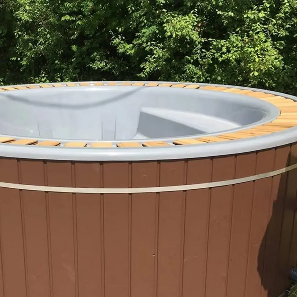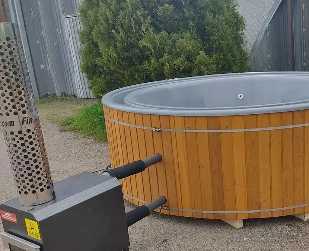 Дана модель комплектується композитною чашею, яка стійка до ультрафіолету, не гниє, не ржавіє, дерев’яною обшивкою на вибір клієнта навколо чаші та у переливному лотку та зовнішнім котлом з димоходом та грибком (потужність котла на вибір, додатково рекомендуємо захисний кожух для труби з котла).