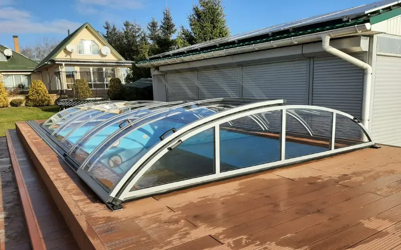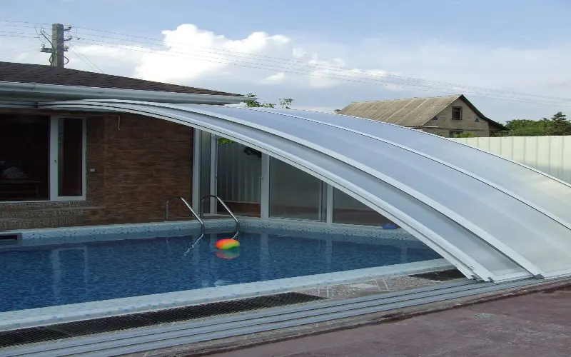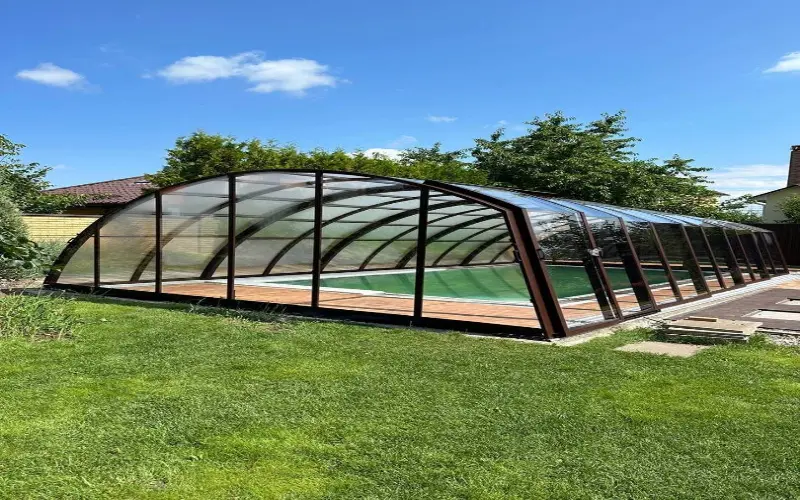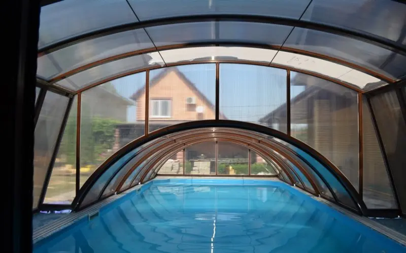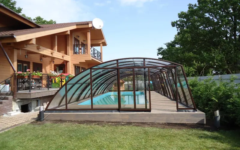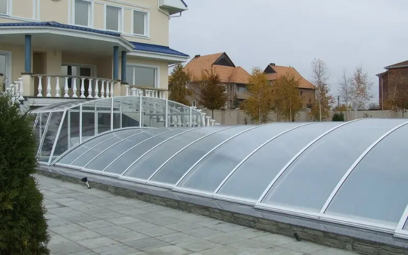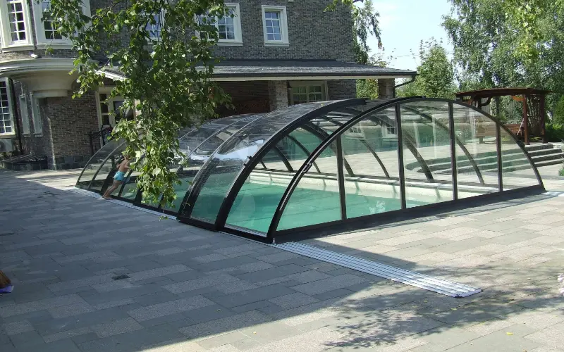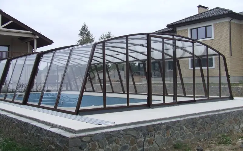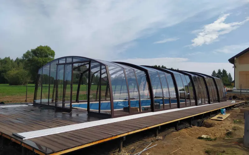- Ограниченная длина конструкции — безрельсовые павильоны обычно используются для меньших бассейнов.