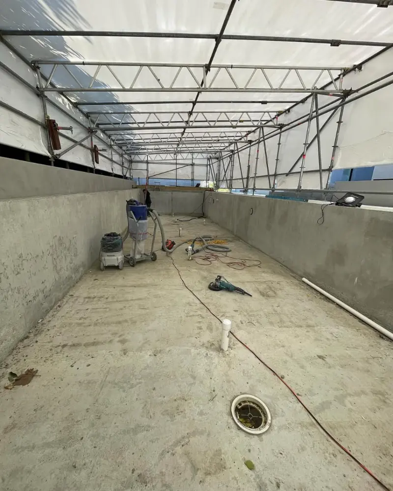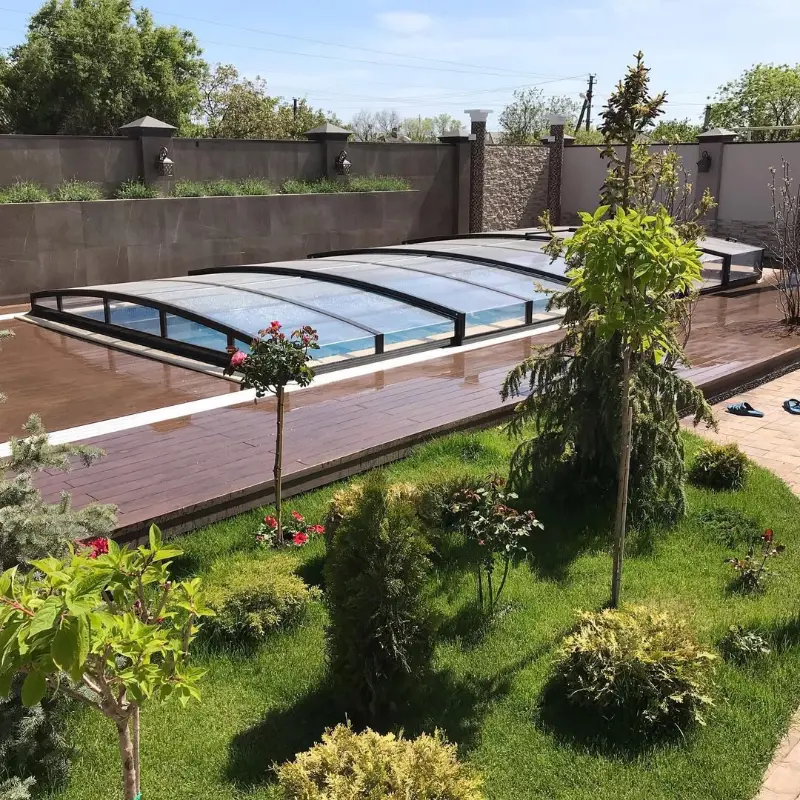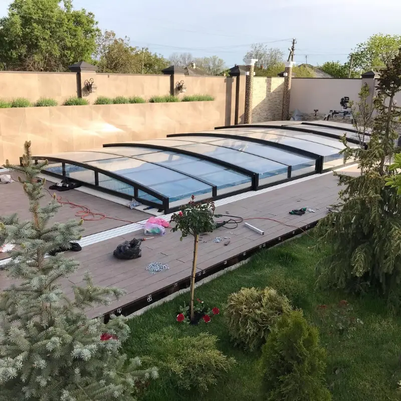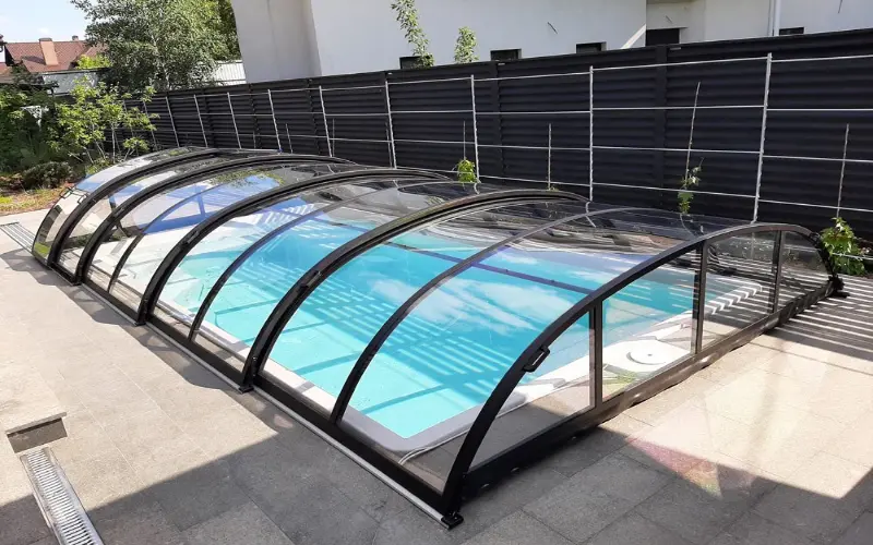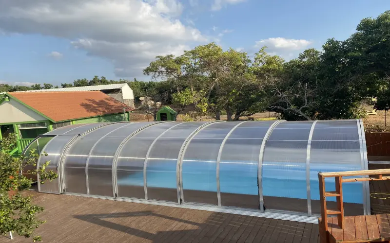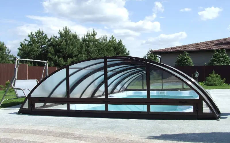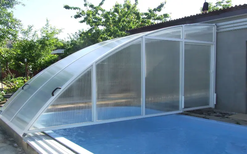 - Ограниченная длина конструкции — безрельсовые павильоны обычно используются для меньших бассейнов.