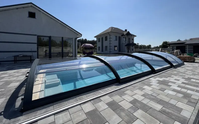 ABRIS – это низкий, функциональный и красивый павильон для бассейна по доступной цене. Он позволяет накрыть бассейн невысокой раздвижной аркой, не закрывая эстетичный вид двора.