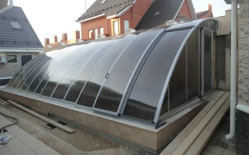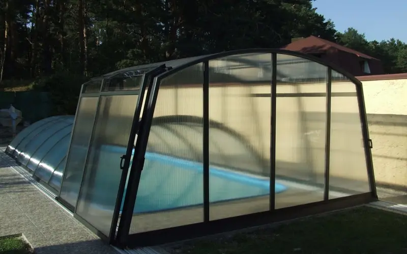 - Павильоны для бассейна из поликарбоната не требуют тщательного ухода и просты в эксплуатации;